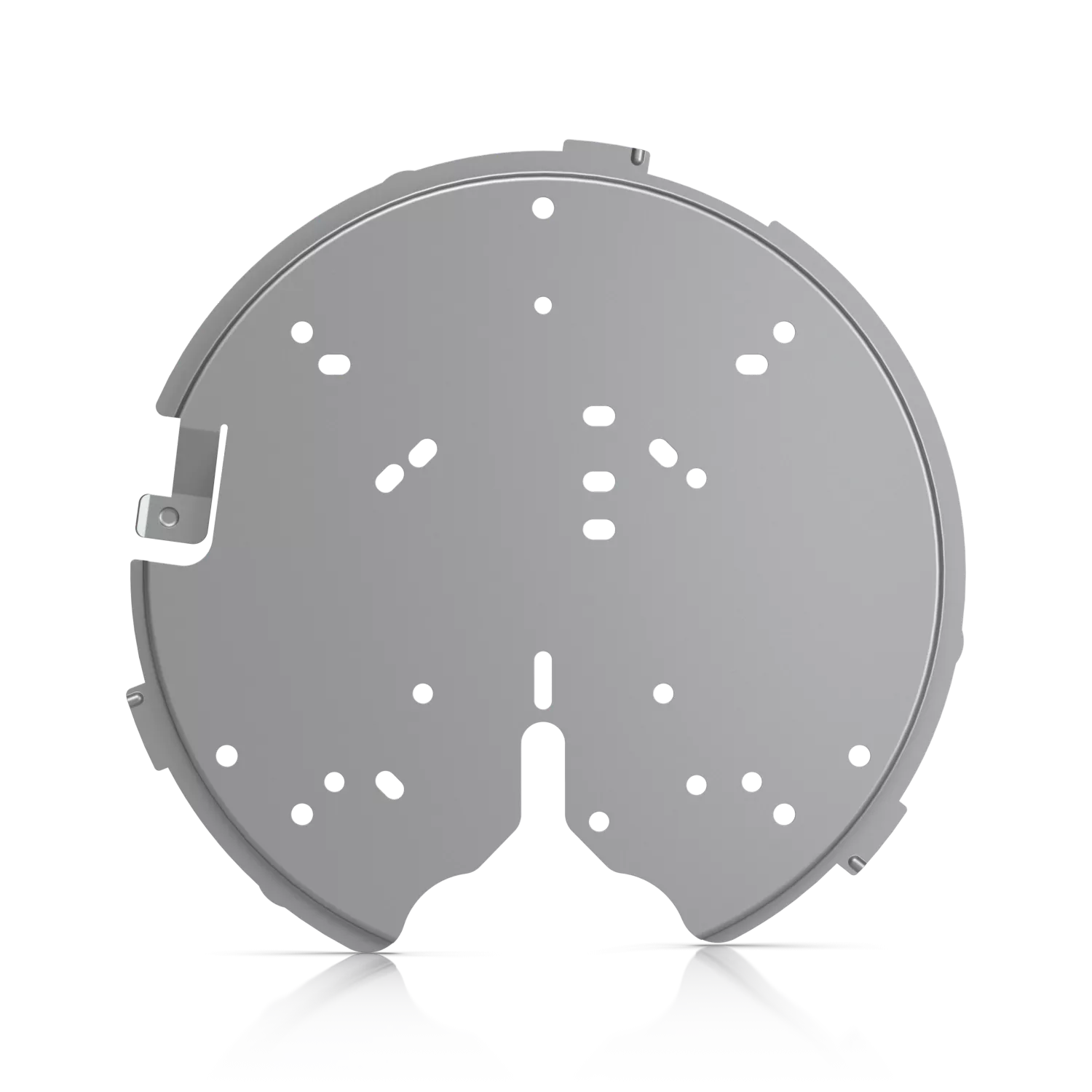 The Ubiquiti UniFi U-PRO-MP is a professional mounting system designed to facilitate the installation of various UniFi access points, including models such as UAP-AC-PRO, UAP-AC-HD, and UAP-AC-SHD. This mounting system features a sturdy metal design with pre-drilled holes and cutouts, allowing for flexible installation in different environments. It supports multiple mounting options, including wall outlets, junction boxes, T-bar ceilings, and more, ensuring compatibility with a wide range of installation scenarios. The included mounting screws and clear labeling of mounting holes simplify the installation process, making it suitable for both professional and DIY setups.